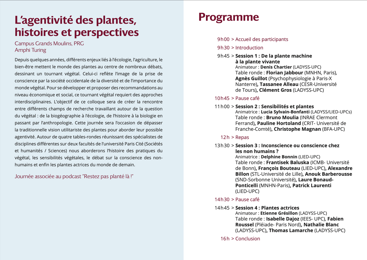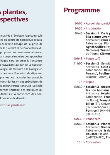 Depuis quelques années, différents enjeux liés à l’écologie, l’agriculture, le bien-être mettent le monde des plantes au centre de nombreux débats, dessinant un tournant végétal. Celui-ci reflète l’image de la prise de conscience par la société occidentale de la diversité et de l’importance du monde végétal. Pour se développer et proposer des recommandations au niveau économique et social, ce tournant végétal requiert des approches interdisciplinaires. L’objectif de ce colloque sera de créer la rencontre entre différents champs de recherche travaillant autour de la question du végétal : de la biogéographie à l’écologie, de l’histoire à la biologie en passant par l’anthropologie. Cette journée sera l’occasion de dépasser la traditionnelle vision utilitariste des plantes pour aborder leur possible agentivité. Autour de quatre tables-rondes réunissant des spécialistes de disciplines différentes sur deux facultés de l’université Paris Cité (Sociétés et humanités / Sciences) nous aborderons l’histoire des pratiques du végétal, les sensibilités végétales, le débat sur la conscience des non- humains et enfin les plantes actrices du monde de demain.