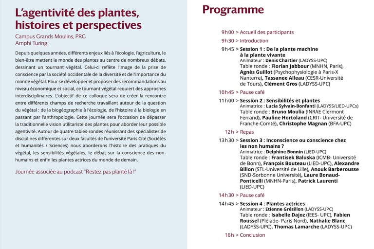 Pour ça, 4 tables rondes ont été imaginées au préalable, rassemblant chacune d'entre elles 4 à 5 chercheurs apportant leur point de vue sur un thème liée à l’agentivité. De la perception que l’on a des plantes aux questions de consciences non humaines en passant par la sensibilité et les plantes en tant qu’actrices, cet épisode promet d’être foisonnant et déstabilisant, à l’image du colloque de décembre 2024.